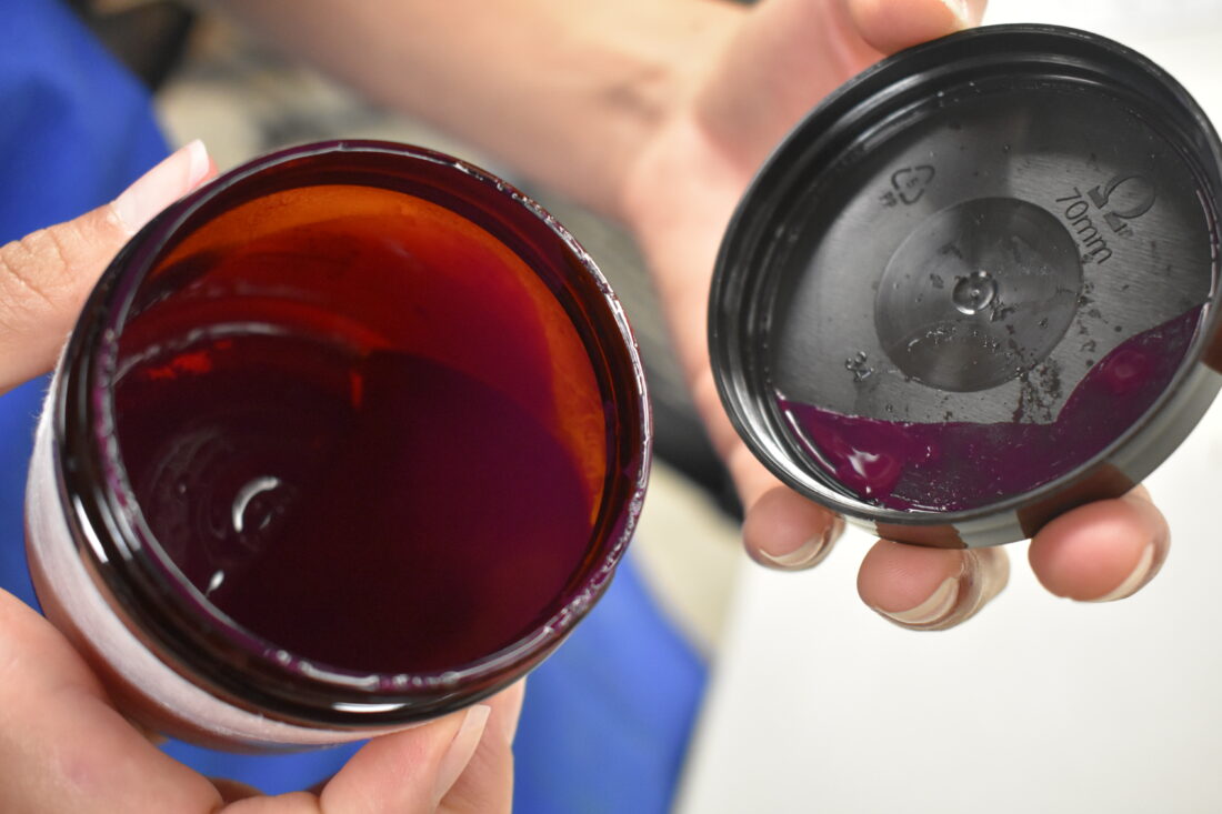 Lynda Grafito opens a jar of ink she made with natural dye produced from the bark of a tree.
