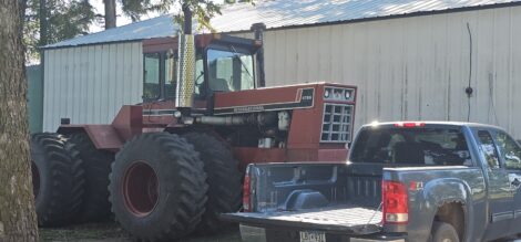 An International Harvester 4786 tractor sits beside a Chevrolet pickup truck outside a barn on the Beranek property.