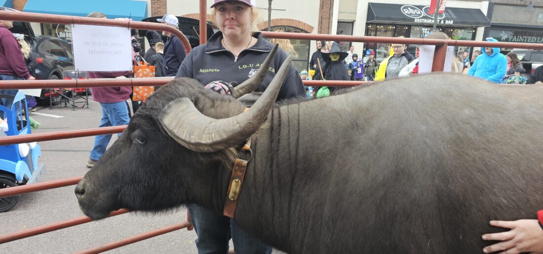Mikaela Arends stands with Worf, a 5-year-old water buffalo, as attendees pet him during New Ulm’s Halloween Hop on Saturday. (Photo by Amy Zents)