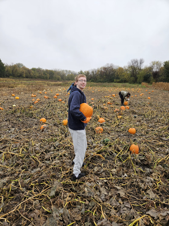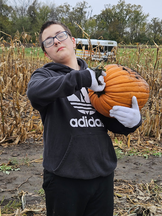 River Bend 11th Grade student Ethan Van Lund carries a pumpkin from the Guldan Family Farms patch. Photo courtesy of River Bend Education District