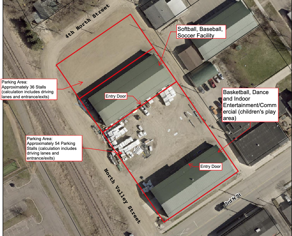 A site map included in the Loose Change, LLC conditional use permit application shows the proposed layout for a children’s activity and sports training facility at 123 N. 3rd St. and 318–326 North Valley St. in New Ulm. The map outlines existing structures, parking areas, and storage zones, including a metal building and concrete block building. Submitted photo