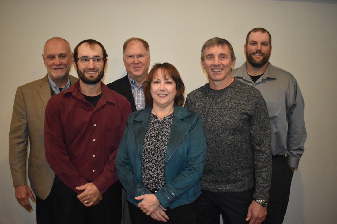 Staff photo by Fritz Busch New Ulm Area Catholic Schools Hall of Fame 2025 inductees from left, Dan Herbeck, Kyle Fischer, Jim Seifert Jr., Laura and Pat Stadick and Zach Fischer.