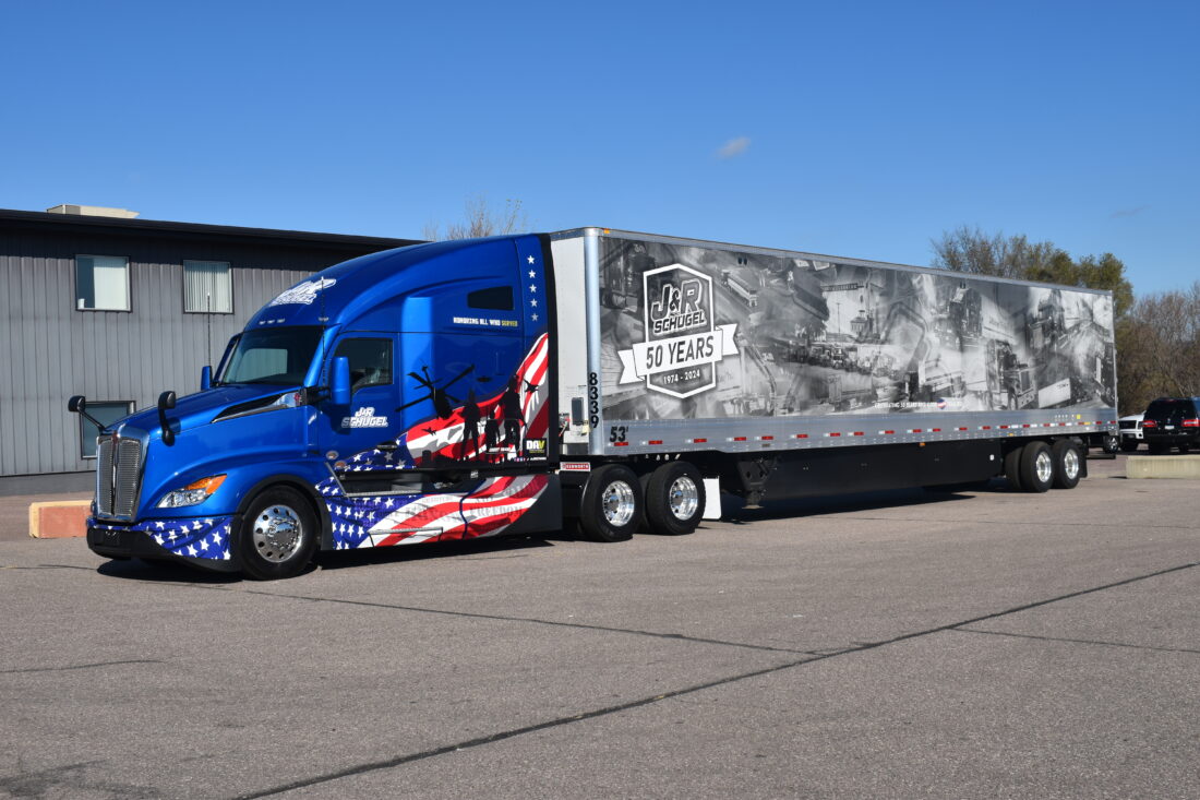 Staff photo by Fritz Busch J & R Schugel Inc. celebrated their 50th anniversary last year wrapping a semi tractor and trailer with veteran’s and historical themes. The company now has 750 trucks and 1,700 trailers.