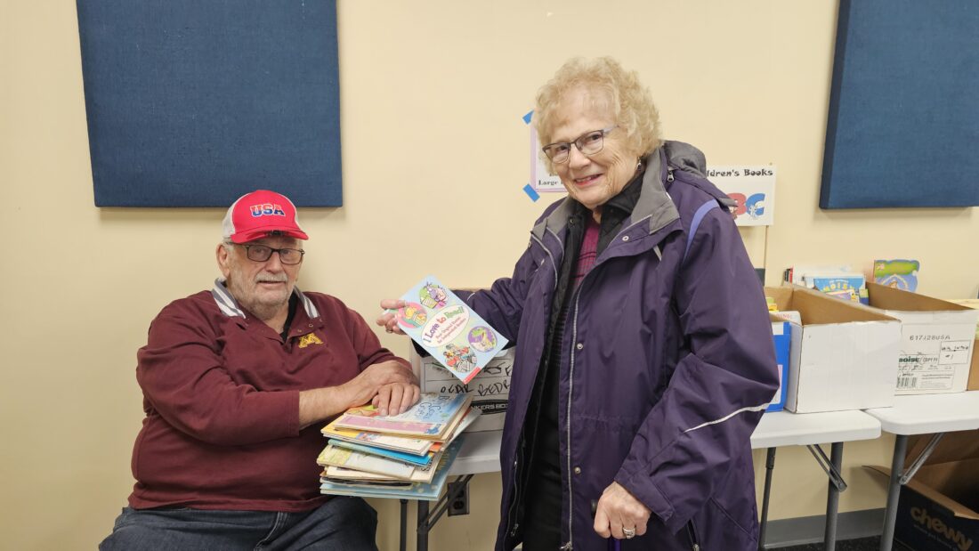 - Norm and Gayle Weiske browse the children’s section at the New Ulm Library book sale, picking out a favorite for their great-granddaughter.