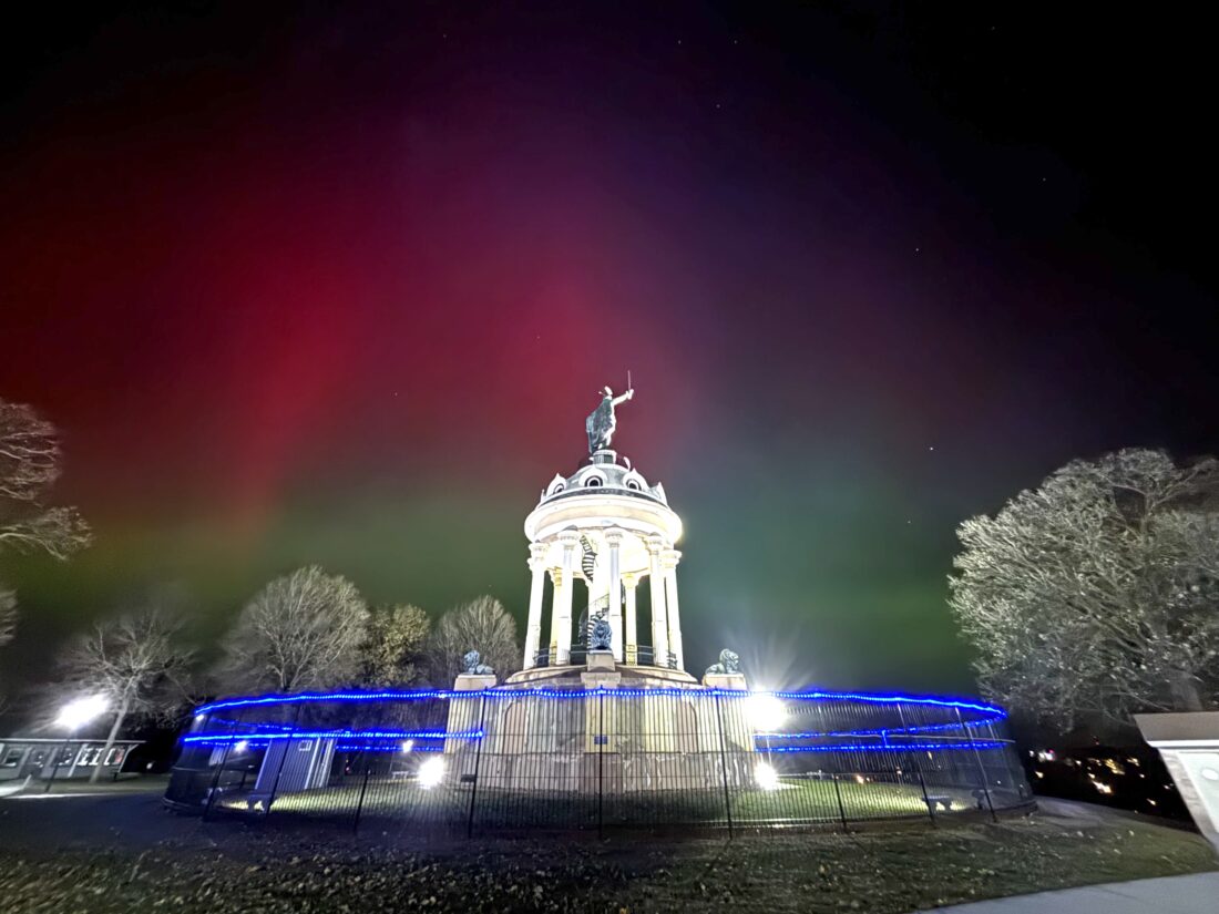 - Hermann Monument backlit by an unusually vibrant Northern Lights. Photo by Wendi Ringhofer.