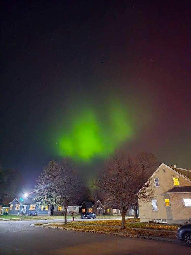 Even in residential neighborhoods with heavy ambient light, the vibrant colors of the Northern Lights were still visible Tuesday. This photo was taken from North Jefferson Street. Photo by Meredith Schladweiler.