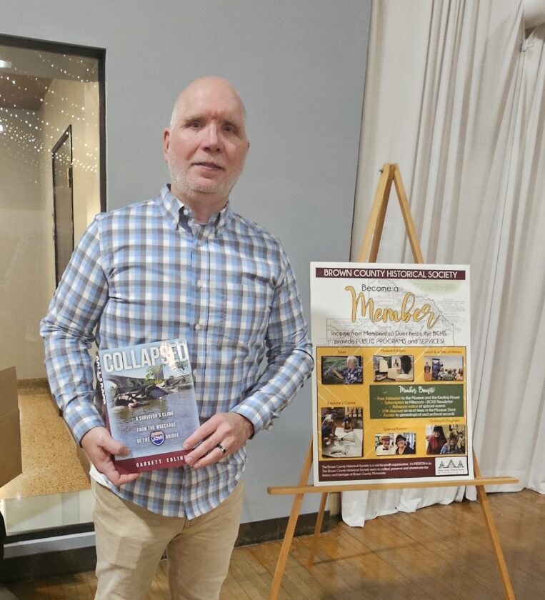 - Garrett Ebling holds a copy of Collapsed, his memoir recounting survival and recovery after the I-35W bridge collapse, during the Brown County Historical Society’s annual gathering.
