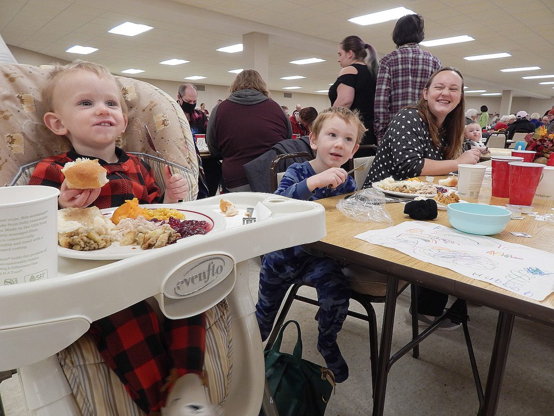 Journal file photo by Fritz Busch Digging into the New Ulm Community Friends Thanksgiving Dinner several years ago are from left, Finley, Ezra, and Jessie Sobania all of New Ulm. The dinner begins at 11 a.m. Thanksgiving Day in the lower level of St. Mary’s Church.