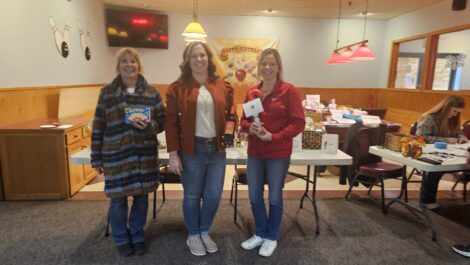 Bridging Brown County Board members Julie Kraus (left), Karen Haala (center), and Pam Rosenau (right) display inaugural Turkey Bowl raffle prizes at Concordia Lanes.