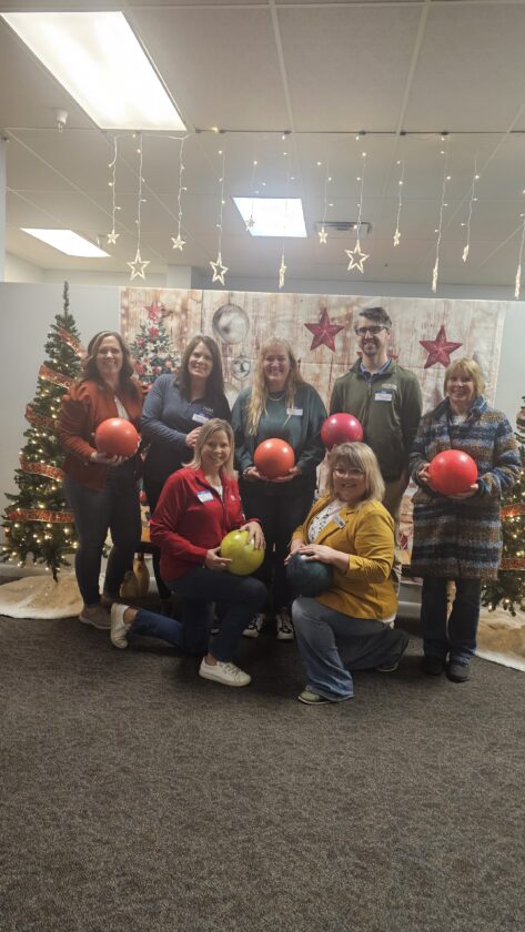 - Bridging Brown County board members pose with bowling balls in front of a photo booth at the inaugural Turkey Bowl event. Photos- Group Photo L – R: 1st row – Pam Rosenau, Erin Hernandez, 2 row – Karen Haala, Tammy Arnsdorf, Annette Olson, John Flemmer, Julie Kraus Bowling Photo – Denise Lienig