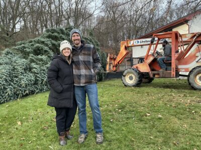 Bobbi and Matt Teske of New Ulm said goodbye to their giant fir tree as it was carefully moved to German Park to serve as the community’s upside-down Christmas tree. (Photo by Amy Zents)