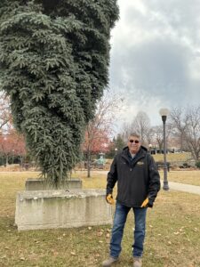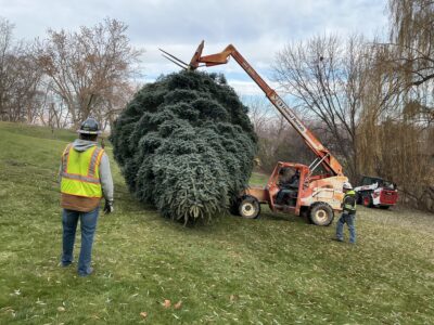 This year’s tree has a special backstory. The impressive blue spruce began its life in the backyard of Bobbi and Matt Teske, longtime New Ulm residents who decided the time had come to part with the tree that had grown far larger than they anticipated.