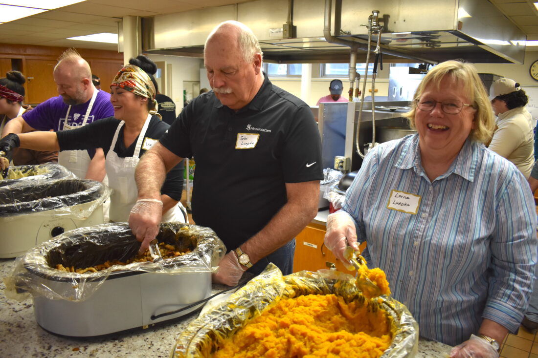 - Volunteers for the Community Friends Thanksgiving dinner serve up the food for dine-in guests. From left to right: Charlie Johnston, Lisa Kaye, John Luepke and Lorna Luepke.