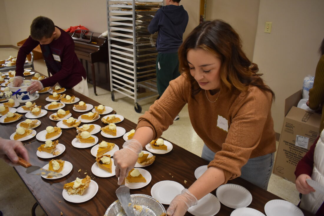 - Volunteer Lorena Hernandez scoops up a slice of pumpkin pie for a take-out box.