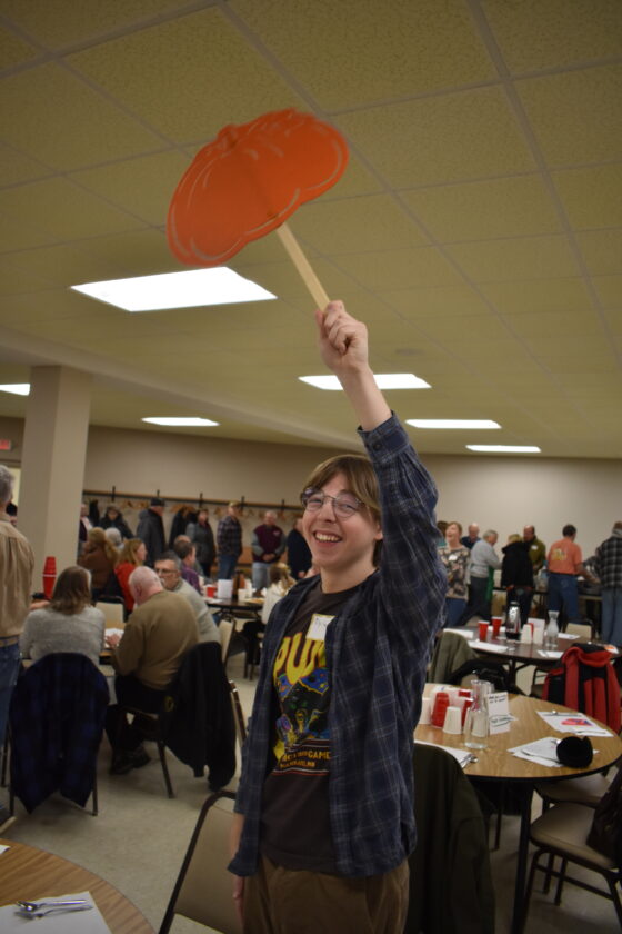 - Dylan Jackson, a volunteer for the New Ulm Community Friends Thanksgiving dinner, waves over dine-in guests to an open table.