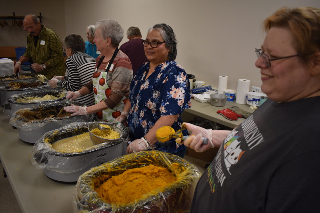 The take-out line at the New Ulm Community Friends Thanksgiving was busy Thursday. The number of take-out meals was higher than normal. Idalia Saenz and ReBecca Geiger (right) served up the corn and squash. Though it was busy Saenz and Geiger said it was fun to help.