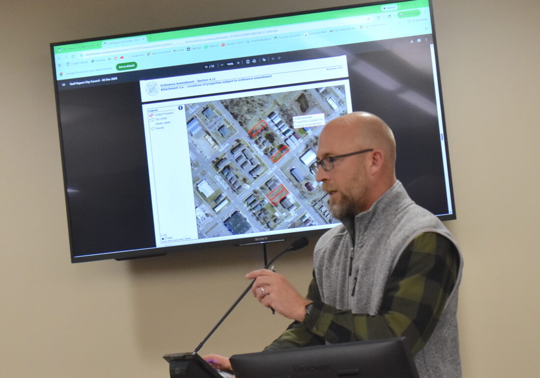 New Ulm City Planner John Knisley shows the New Ulm City Council the four lots impacted by the proposed amendment to the city’s zoning plan. The four lots are outlined in red and all located on South German Street. Photo by Clay Schuldt