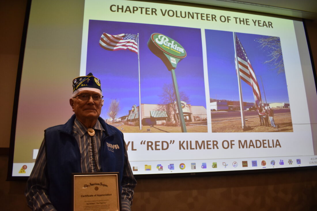 Staff photo by Fritz Busch 'Red The Flag Guy' Kilmer of Madelia received the New Ulm Chapter 15 Disabled American Veterans (DAV) Volunteer of the Year Certificate at the Sleepy Eye Event Center Saturday. Kilmer has been repairing U.S. flags for more than 60 years at no charge.