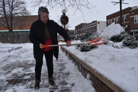 Staff photo by Fritz Busch Brenda Guldan of rural New Ulm shovels snow in front of the Breath of Life Gathering Center, 226 North Minnesota Street North Friday. The building formerly housed Wells Fargo Bank.