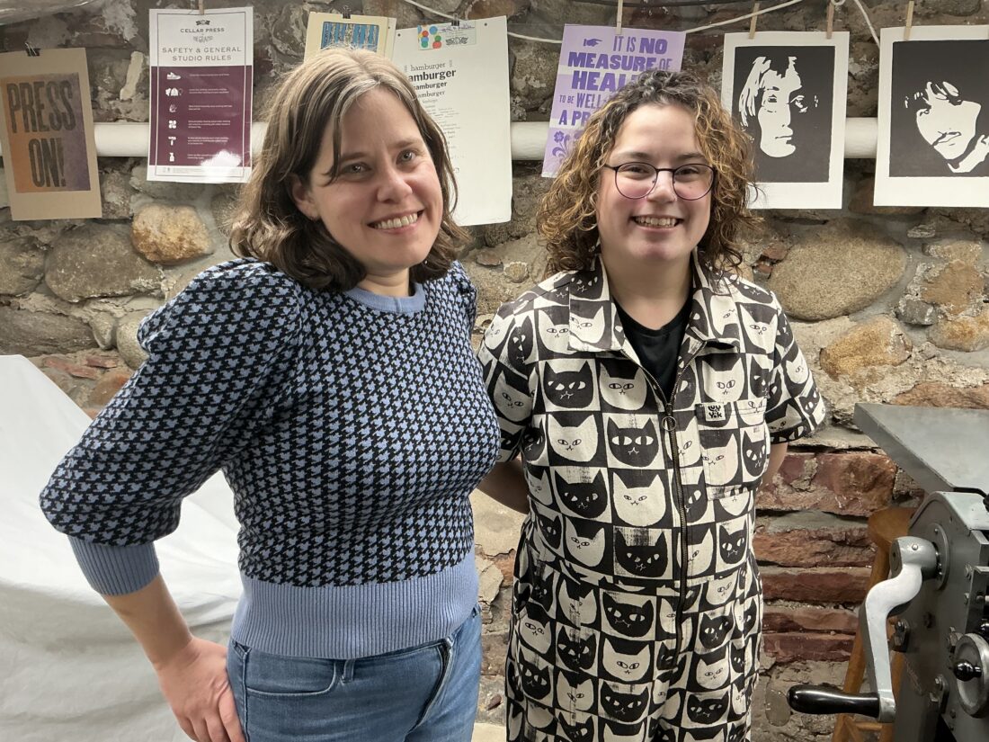 - From left, Cellar Press coordinator Tegan Daly and artist-in-residence Charlie Andrés at the Grand Center for the Arts’ Cellar Press studio during Friday’s Artist in Residence Showcase.