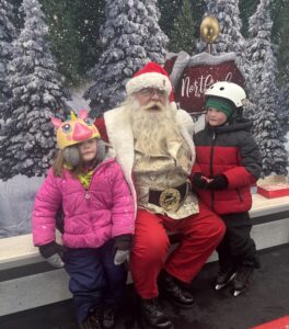 Esley Schultz, Santa Claus, and Everet Schultz pose for a photo during Santa Skate, a non-profit event hosted by New Ulm Parks and Recreation in partnership with the New Ulm Area Emergency Food Shelf.