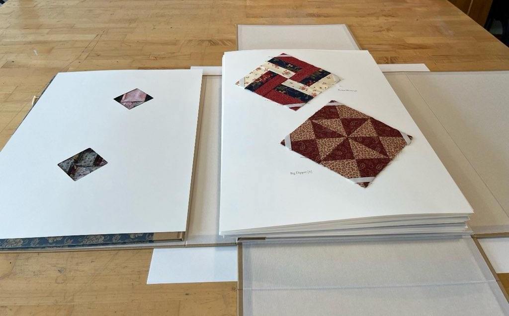 Mary Hartten’s ‘Unfinished Piece’—a glimpse at the book both folded and spread out, revealing the quilted squares, meticulous stitching, and ironing on the backs. Binding is intentionally absent, letting the work breathe on its own. (photos by Randy Hartten)