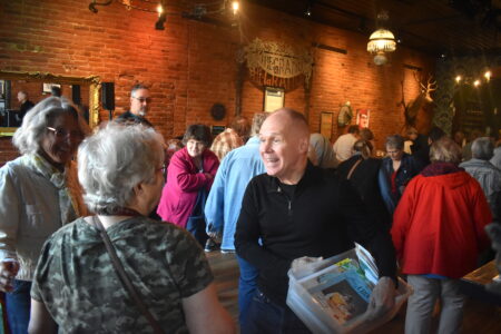 - Cathy Hartten (left) and Randy Hartten (right) walk up to and embrace old friend Michaela Lynaugh (center). During the Grand’s Oct. 2023 sale of Mary Hartten’s fabric. File photo by Dan Olson