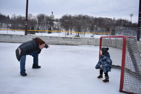 - Shilo Arndt shows her 3-year-old son Attie Arndt how to guard the goal at the outdoor Harman Park hockey rink.