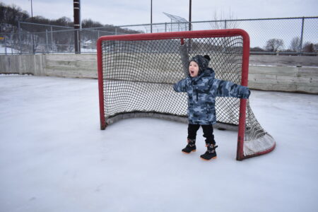 Three-year-old Attie Arndt practices his hockey goalie stance at Harman Park rink Wednesday. Though Attie has watched his cousins play hockey before, this was his first time on the ice. Though he does not have his own skates yet, his mother said she would start teaching him to skate soon.