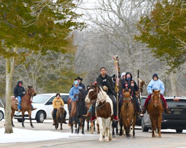 The Makatoh Reconciliation Healing horse riders leave Land of Memories Park on Dec. 26, 2024 where they met up with a second group of riders coming in from Santee Reservation in Nebraska. Leading the group as staff carriers in front- Isaiah Keeble of Fort Thompson South Dakota, grandson of Crow Creek Elder Wilfred Keeble and Brandon Atkinson of Fairmont Minnesota. The riders are about to complete the last leg of their 330 mile journey to honor their ancestors Photo by John Kellen