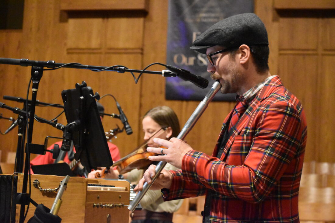 Staff photo by Fritz Busch Lutheran Ceili Orchestra bandleader Joey Schumann, right, plays a tin whistle and flute at ChristSong, a Celetic Christmas Concert at Martin Luther College Chapel of the Christ Saturday. Violinist Rebekah Brunoehler is pictured to the left of Schumann.