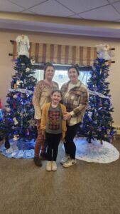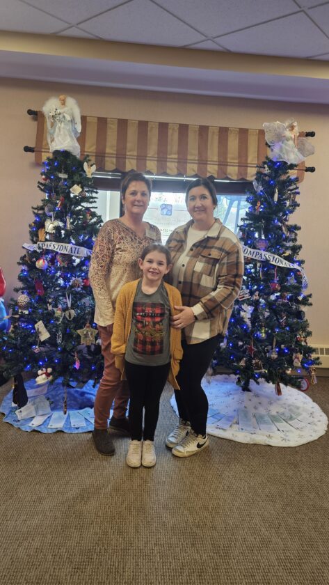 In photo From left: Cindy Rueckert, receptionist at Oak Hills Living Center; Allison Fischer; and her mother, Oak Hills RN Katie Fischer, stand in front of the two Remembrance Trees at Oak Hills Living Center.