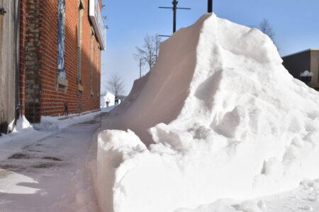 Staff photo by Fritz Busch A large snowdrift is pictured on 3rd North St. near the Minnesota St. intersection Monday. The snow was removed by a snowblower later Monday. The City of New Ulm declared a Downtown Snow Emergency for Tuesday, Dec. 30, from 1:30 a.m. to snow removal completion.