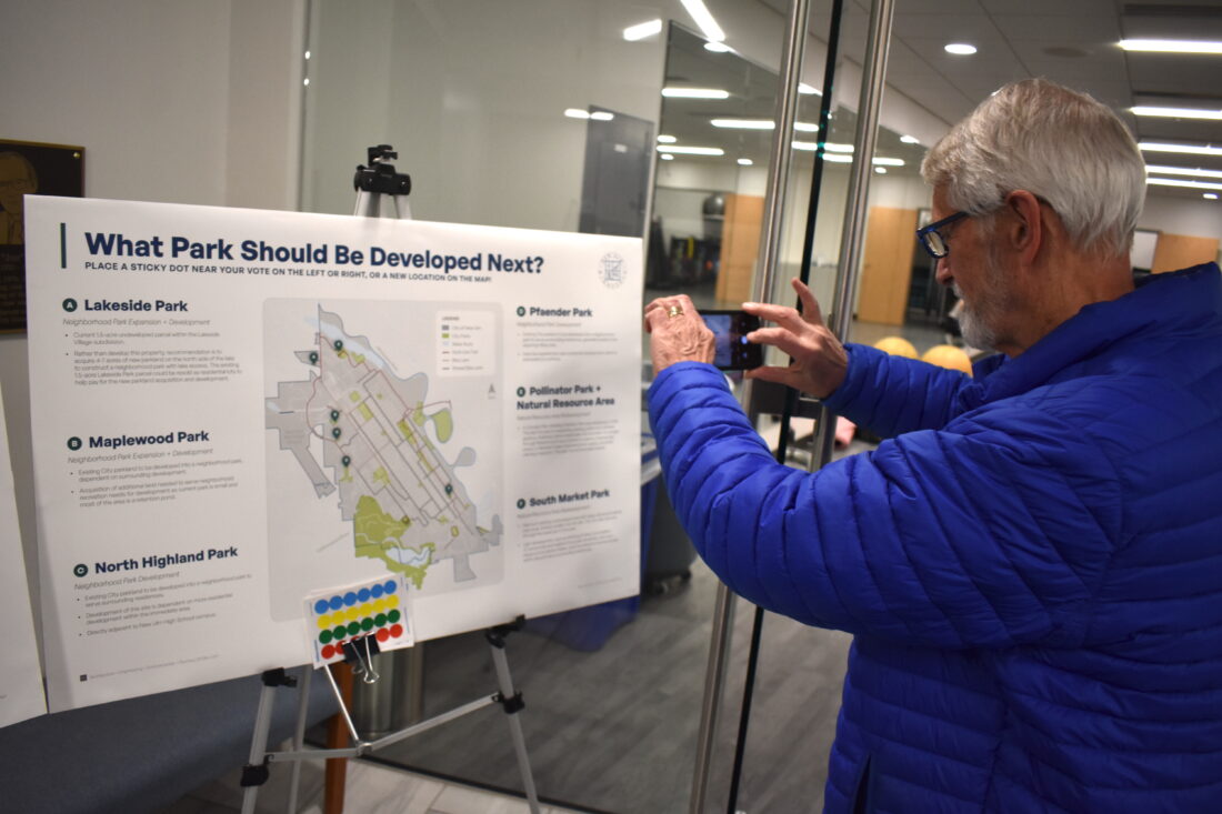 Scott Schmeiling snaps a photo during the Park and Rec Master Plan open house. The public was asked to provide further feedback on the draft plan. Visitors were asked to vote on which New Ulm Park should be developed next.
