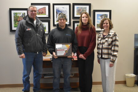 Andy Lilleodden holds the inaugural Chamber Volunteer of the Year Award. Lilleodden was nominated for the award by multiple individuals for over a decade of service to the Chamber. In photo left to right: Chamber board member John Gag, Volunteer of the Year recipient Andy Lilleodden, Chamber President Sarah Warmka and Chamber board member Brie Taralson.