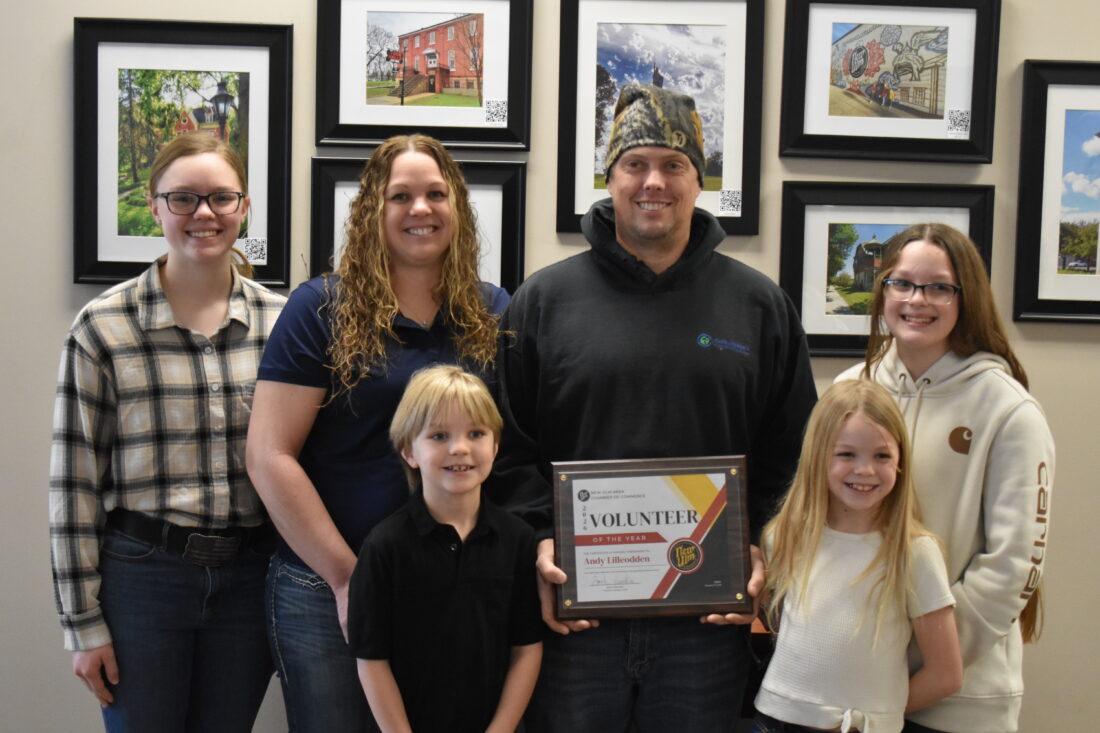 Andy Lilleodden celebrates receiving the New Ulm Chamber’s Volunteer of the Year Award with his family. Lilleodden was surprised with the award Monday at the Chamber office. Lilleodden will receive official recognition at the Chamber Annual Meeting, Tuesday, Feb. 10, at Turner Hall. In photo left to right: McKenzie Lilleodden, Nancy Lilleodden, Tucker Lilleodden, Any Lilleodden, Kaytlin Lilleodden and Brittney Lilleodden.