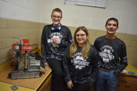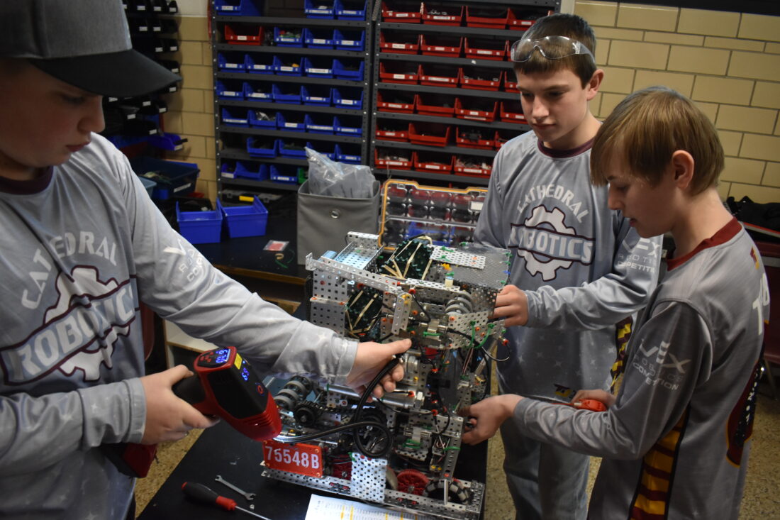 - Cathedral High School robotics team, Gear Shifters, work on their robot during Saturday’s tournament. The Gear Shifters designed their robot around defense. In photo L to R: Emmett Gaalswyk, Peyton Weisbrich and Aaron Beranek.