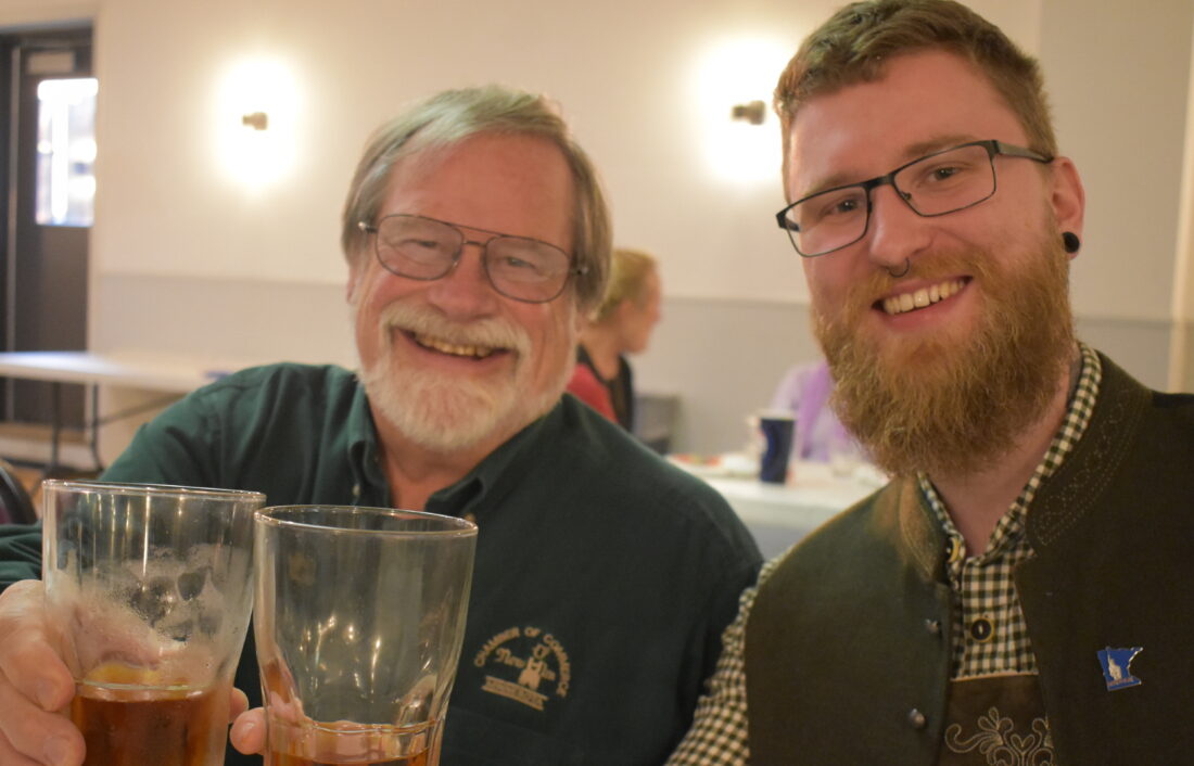 Richard Seeboth (left) shares a toast with Hans-Joos Exchange intern Samuel Knoops during a Sister Cities Commission welcoming event in New Ulm last September. Seeboth, a longtime commission member, has hosted numerous exchange participants and played a key role in shaping the program’s modern practical training exchanges. Photo by Clay Schuldt