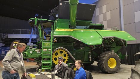 - Attendees examine John Deere’s latest combine harvester technology at the MN Ag Expo at the MCHS Event Center.