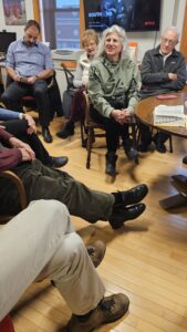 Meetings are intimate, allowing for lively conversation and personal storytelling. Among the participants is Heidi Hinkley, fluent in German, who often adds linguistic insights.