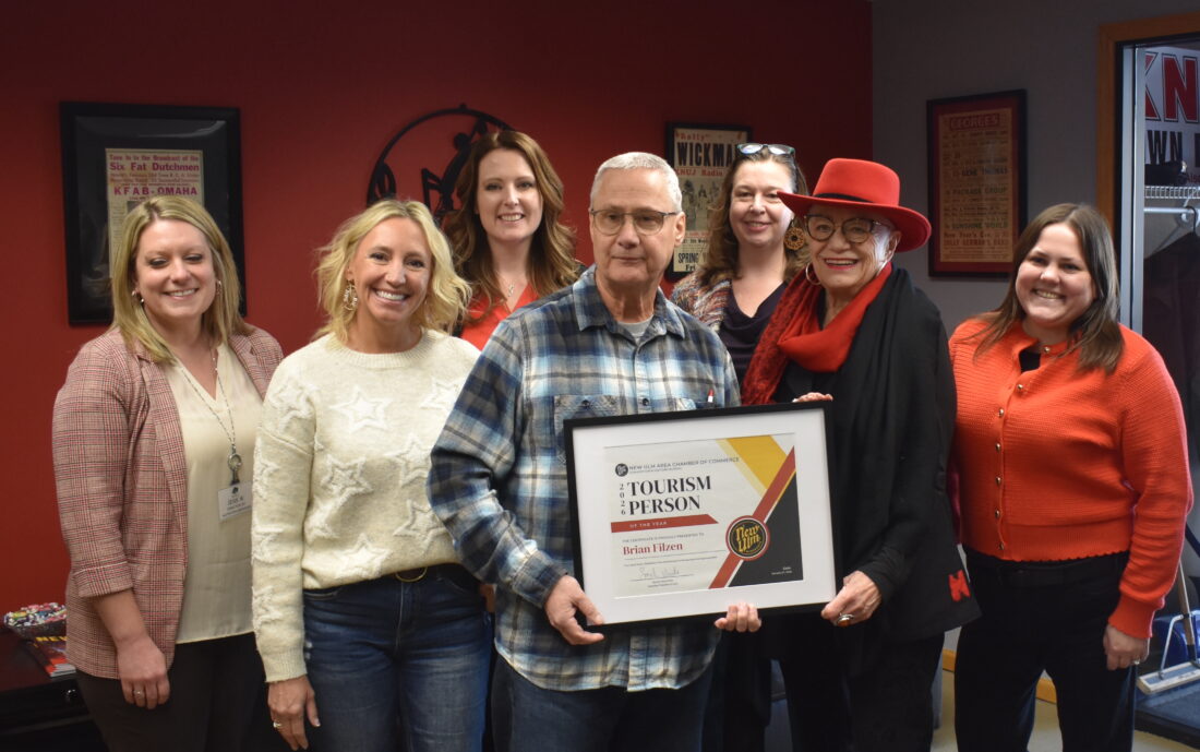 - Brian Filzen holds his newly received Tourism Person of the Year Award. Members of the New Ulm Area Chamber and the New Ulm Convention & Visitors Bureau (CVB) dropped into Filzen’s office at KNUJ to present him with the award and thank him for all he does to promote New Ulm. In photo L to R: CVB member Jessica Weisbrich, CVB memberChar Reinhart-Kalk, Chamber President Sarah Warmka, Brian Filzen, CVB member Amy Johnson, Mayor Kathleen Backer and Chamber Tourism & Member Services Manager Sarah Sveine.