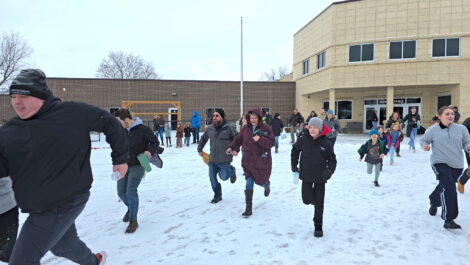 - Participants in St. Paul Lutheran’s 10th annual Amazing Race make a dash for their vehicle following the starting gun for the competition. This year’s participants had to contend with a light snowfall. Photo by Meredith Schladweiler