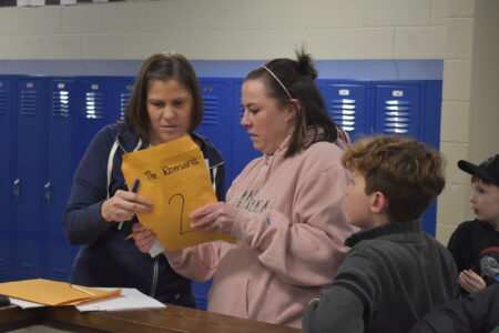 St. Paul Lutheran’s Elementary teacher Christine Baganz (left) checks the answers provided by a member of “The Roman’s” team during The Amazing Race competition.