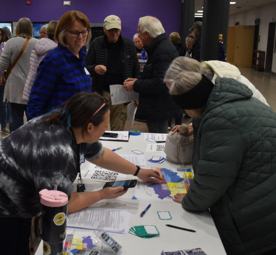 Jen Jackson helps DFL voters identify which precinct they belong to during the New Ulm caucuses.