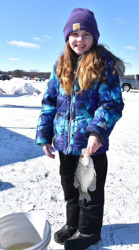 Journal file photo by Clay Schuldt Ryder Britton holds a crappie she caught on her 10th birthday at the 2022 New Ulm Sportfishermen Ice Fishing Contest at Clear Lake. The 2026 ice fishing contest begins at 11 a.m. Saturday and continues to 3 p.m. Registration begins at 10:30 a.m.