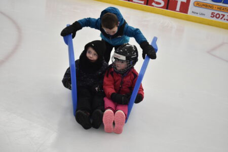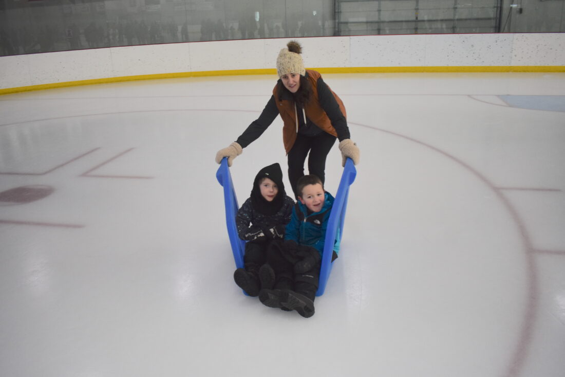 - Allie Smith pushes Adrian Tarlson (left) and Bryer Smith (right) on Civic Center Ice during Washington Learning Center’s (WLC) annual boot skate program Thursday.