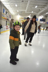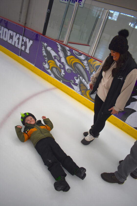 A couple other preschoolers had fun sliding on their backs. Three-year-old Onyx Hughes was pretending to be a curling stone as his mom Kaitlin Hughes and his aunt Brook Bejarano slid him back and forth. Both his mom and aunt are staff at WLC and were able to spend time with him during his first skating experience.