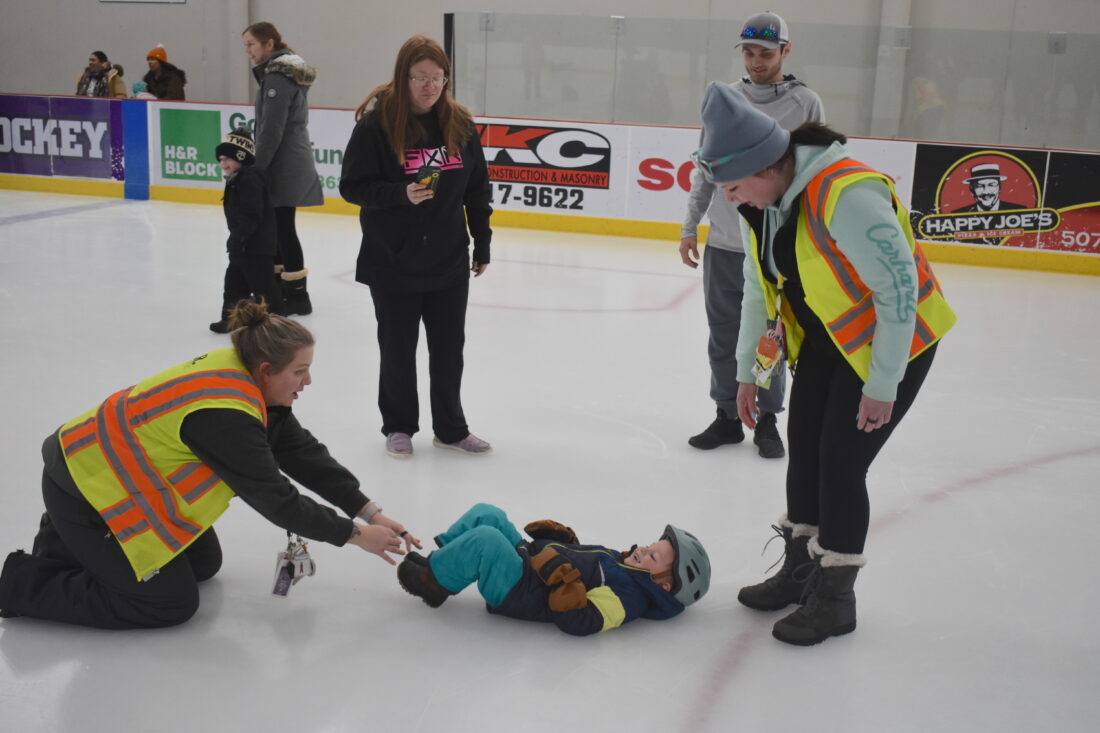Karla Deutschmann watches as 4-year-old Quinn Howk walks on the Civic Center ice rink. This is Howk’s first time on the ice. She said it felt weird, but she liked it.