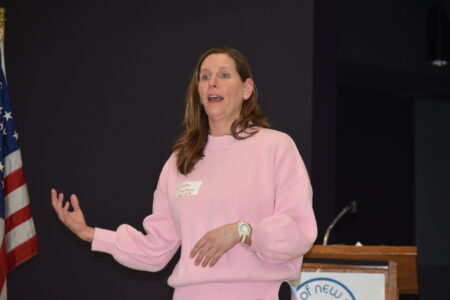 Staff photo by Fritz Busch U.S. Senator Angie Craig talked about getting out of the trade war and expanding legal immigration at the Brown County DFL Convention Saturday.
