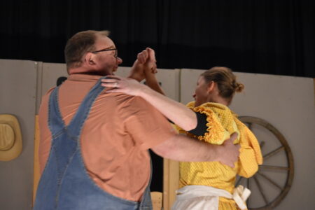 - Staff photo by Fritz Busch Ken Johnson, a farm boy looking for a wife, dances with mercantile clerk Kelli Sorenson as the Morgan Players rehearse “The Groom Has Cold Feet.” The audience participation mystery will be performed Feb. 27-28 and March 1 in Cedar Mountain Auditorium.